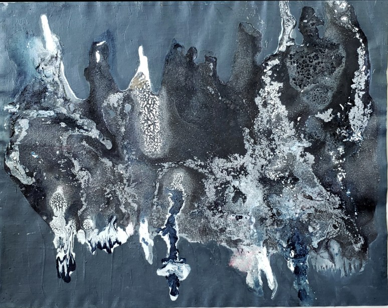 “Bridging with Ink”, French clay, salts, laser in on canvas. 12″ x 30″ on canvas