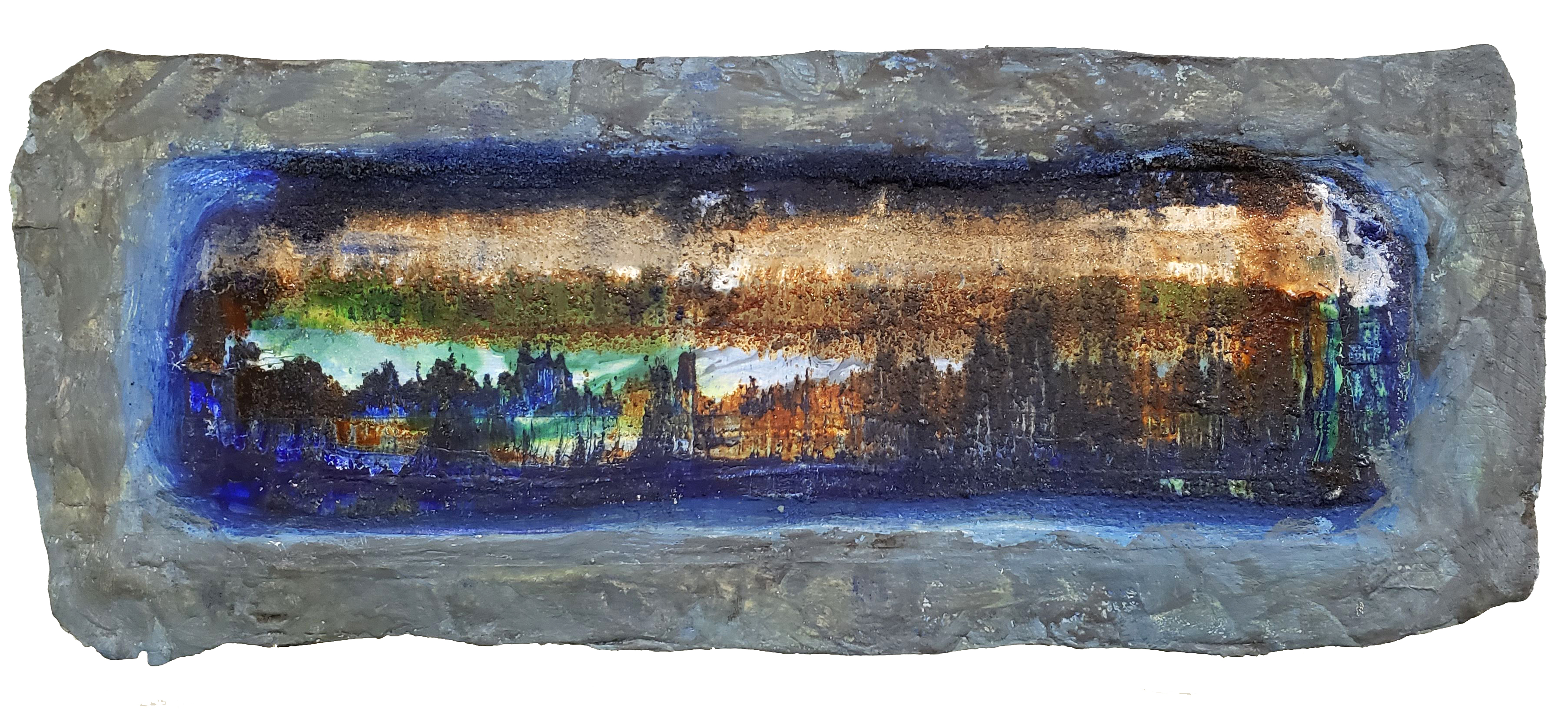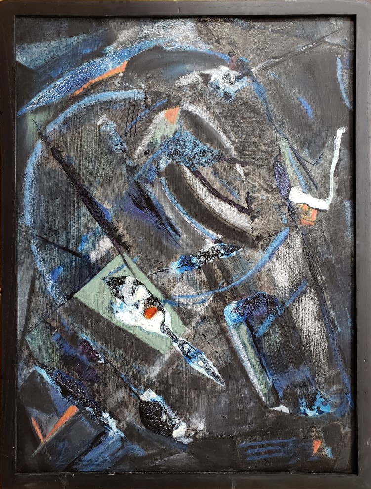 “Street Corner”, oils, acrylic, inks, glues, salts on canvas. 17″ x 21″ framed