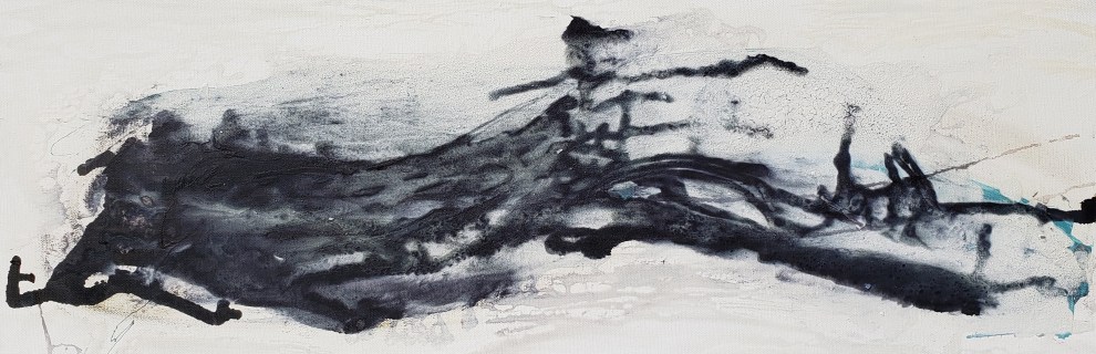 Salt and Blue, Oil, ink, salt, powder, watercolor on canvas, 14″ x 24″
