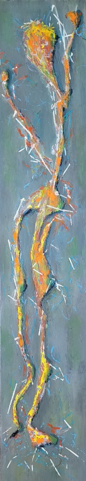 Cellular Circus, 2023, encaustic on board, 30″ x 18″ (Sold)12″ x 96″, 2023 Latex, oil paint on treated paper board