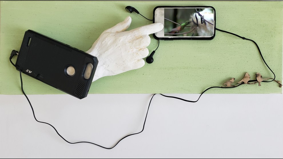 This series is built from the viewpoint of the future — what might remain, be transformed, be unearthed, and wondered at. These pieces include recycled and reclaimed bits of tech from once “new” inventions like fruit bags, staples, audio cassette tapes and CDs to the ubiquitous cell phone.